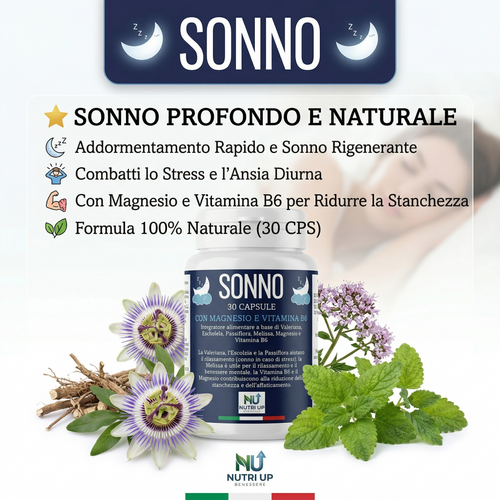 NutriUp SONNO. Integratore Naturale per Sonno e Rilassamento. Con Valeriana, Escolzia, Passiflora, Melissa, Magnesio e Vitamina B6. Calma lo Stress e Riduce l'Affaticamento Mentale. 30 Capsule